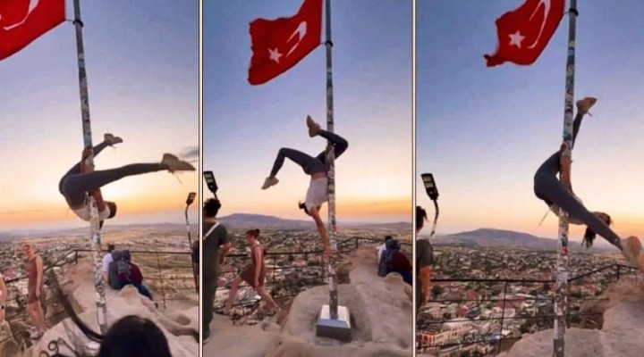 Nevşehir’in Uçhisar beldesinde yabancı uyruklu bir kişinin Türk bayrağı direğinde dans ettiği anlara ait görüntüler sosyal medyada gündem oldu. Nevşehir Valiliği, görüntülerin yayılması üzerine yaptığı açıklamada, olayla ilgili adli tahkikat başlatıldığını duyurdu.