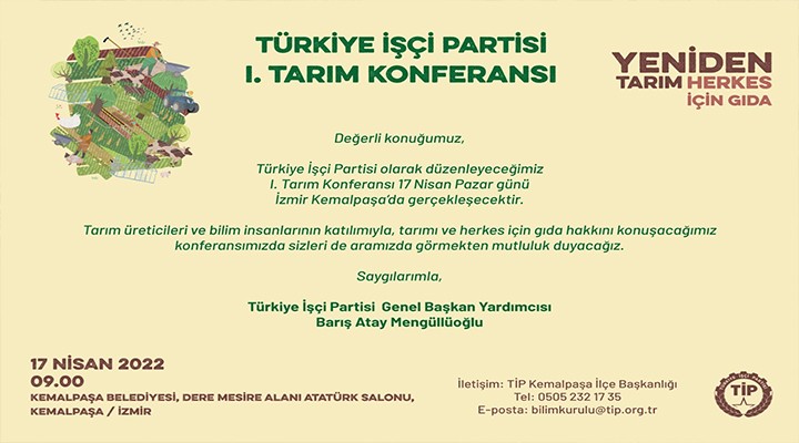 Türkiye İşçi Partisi ve TİP Bilim Kurulu öncülüğünde 17 Nisan Pazar günü İzmir, Kemalpaşa’da TİP I. Tarım Konferansı’nı düzenlenecek. İşçi Partisi'nden yapılan açıklamada konuyla ilgili şöyle denildi: