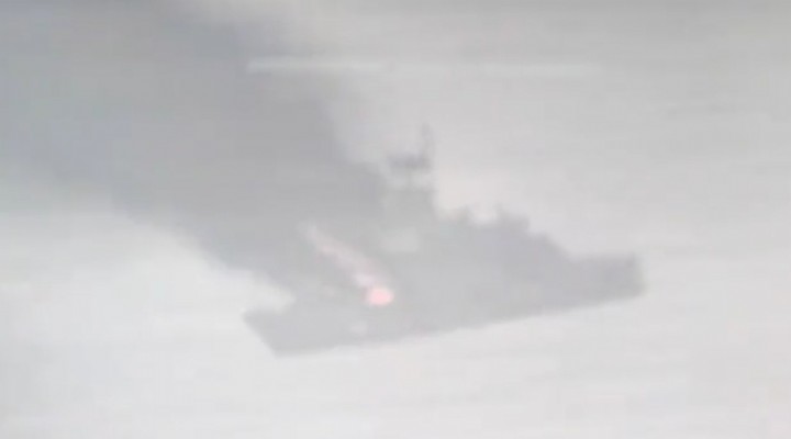 Sosyal medyada paylaşılan fotoğraflarda Rus gemisinden yükselen dumanlar görülüyor.