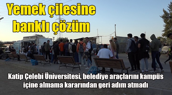 Gündeme oturan o görüntülerin ardından, CHP'li İzmir Büyükşehir Belediyesi'nin üniversite öğrencilerine ücretsiz yemek hizmetine kapıları kapatan İzmir Katip Çelebi Üniversitesi yönetimi, yine de geri adım atmadı. Fakat, kampüs içine girmelerine izin verilmeyen belediye ekipleri, bu kez üniversite kapısı önüne bank ve masa getirip yemek dağıtımını sürdürdü. Kaldırımda ve eski lastiklerin üzerinde yemek çilesine son veren belediye ekipleri, öğrencilerden takdir topladı. Ancak, okul önündeki yüzlerce metrelik bedava yemek kuyruklarının azalmadığı görüldü. Öğrenciler, yemek alabilmek için metrelerce uzunluktaki kuyrukta bekledi. Bazı öğrenciler, masaların ve bankların boşalmasına beklememek için yine de yerde yemek yemeyi tercih etti.
