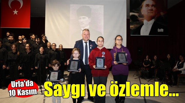 Cumhuriyet Meydanı’nın ardından Hakan Çeken Kültür Merkezi’nde düzenlenen törende Büyük Önder Mustafa Kemal Atatürk, öğrencilerin hazırladığı şiirler, oratoryo ve türkülerle anıldı. Günün anlam ve önemini belirten konuşmanın ardından, Urla genelinde yapılan 10 Kasım Atatürk’ü anma konusunun işlendiği şiir, kompozisyon ve resim yarışmasında dereceye giren öğrencilere ödülleri Urla Kaymakamı Mustafa Gözlet, Garnizon Komutanı Deniz Albay Serdar Akan ve Urla Belediye Başkanı Selçuk Balkan tarafından verildi.