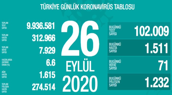 Sağlık Bakanlığı’nın açıkladığı 25 Eylül corona virüsü tablosuna göre bin 665 vaka tespit edilmiş, 73 kişi yaşamını yitirmiş ve bin 318 hasta sağlığına kavuşmuştu.