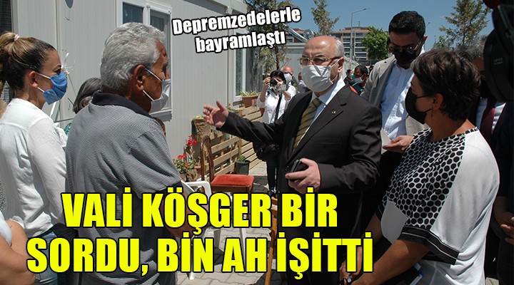 İzmir Valisi Yavuz Selim Köşger, 118 kişinin yaşamını yitirdiği 30 Ekim depremi sonrası evleri yıkıldığı ya da binaları hasar aldığı için Bayraklı Adalet Mahallesi'nde kurulan konteyner kente yerleştirilen depremzedeleri ziyaret etti. 196'sı çocuk 813 kişinin yaşadığı 288 konteynerdeki bazı depremzedelerin Ramazan Bayramı'nı kutlayan Vali Köşger, etrafını saran çocuklara 10'ar TL harçlık verdi. Bazı ailelere çikolata paketleri veren Köşger'den depremzedeler birçok talepte bulundu. Bazı depremzedeler de isteklerinin yerine getirildiğini belirterek, çalışmalardan dolayı Köşger'e teşekkür etti.