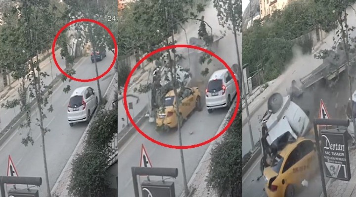 Öte yandan, kaza anı ise bir evin güvenlik kamerası tarafından kaydedildi. Görüntülerde; elektrik kablosu yüklü vincin hızla devrildiği ve karşı şeritten gelen bir otomobilin şans eseri kurtulduğu, diğer şeritten ticari taksi ve otomobili altına alması saniye saniye kaydedildi.
