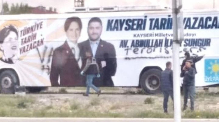 Kayseri’nin Kocasinan ilçesi Argıncık Mahallesinde İYİ Parti 2. sıra Milletvekili Adayı Abdullah İlker Sungur’un tanıtımının yapıldığı seçim otobüsüne kimliği belirsiz kişi ya da kişiler tarafından “Vatan haini teröristler” yazıldı.