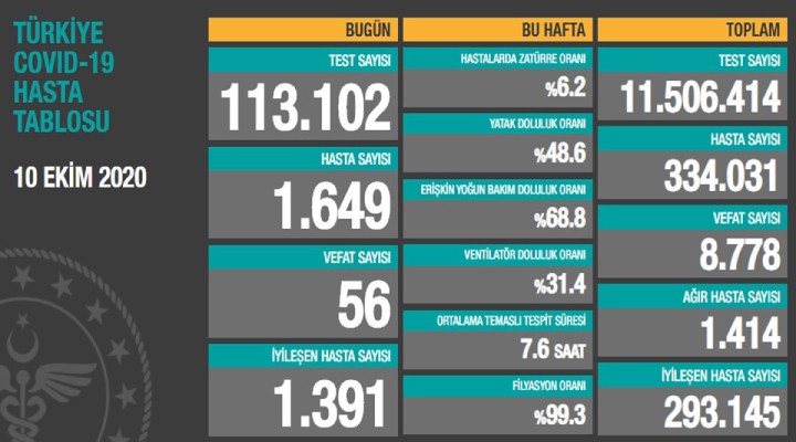 Verilere göre Türkiye genelinde yatak doluluk oranı yüzde 48.6, erişkin yoğun bakım doluluk oranı yüzde 68.8 ve ventilatör doluluk oranı yüzde 31.4 olarak duyuruldu.