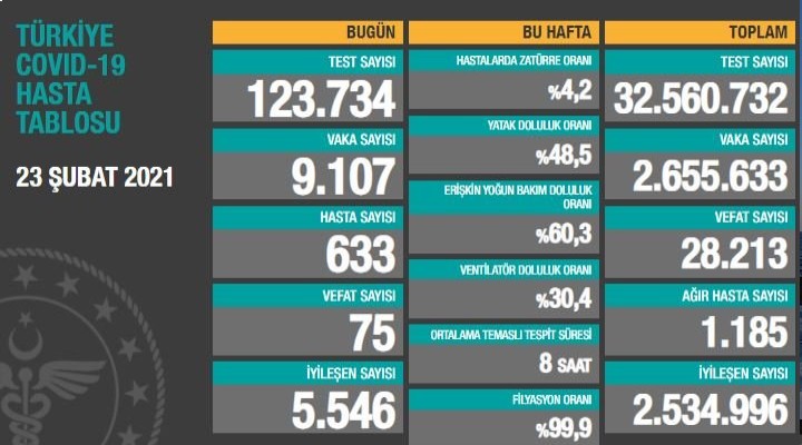 Sağlık Bakanlığı, koronavirüsü salgını nedeniyle yaşanan yeni can kaybını, vaka ve hasta sayısını açıkladı. Yeni tabloya göre 9 bin 107 yeni vaka tespit edilirken, can kaybı ise 75 olarak açıklandı. Sağlık Bakanlığı, salgın nedeniyle dün 78 kişinin hayatını kaybettiğini, 623 yeni hastayla birlikte toplam 8 bin 104 vakanın tespit edildiğini ve 5 bin 690 kişinin sağlığına kavuştuğunu duyurmuştu.