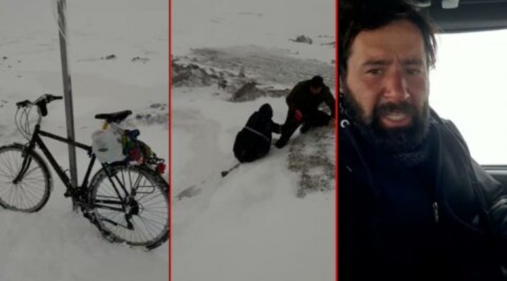 Bisikletiyle Türkiye turuna çıkan Ömer Töremen, Iğdır’dan Kars’a gelirken Digor-Dağpınar arasında etkili olan tipiye yakalandı. Bisikletini yol kenarına bırakan Töremen, kendisi tipiden korunmak için menfeze girdi.