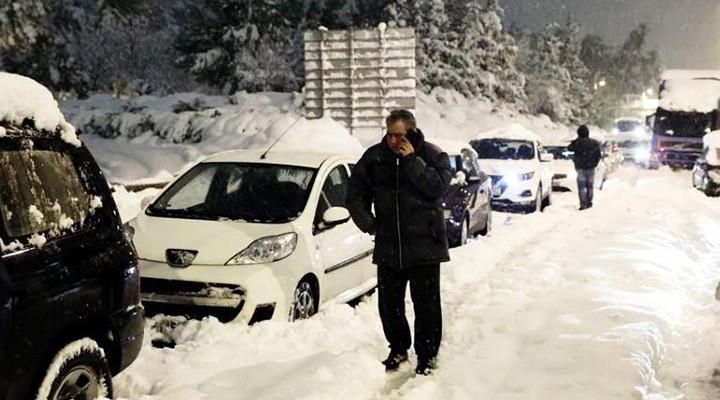 Yunanistan'ın başkenti Atina'yı diğer kentlere bağlayan Attiki Odos otoyolunun 55 kilometrelik bölümünde dün saat 12.00'den itibaren başlayan yoğun kar yağışı nedeni ile yaklaşık 1200 araç mahsur kalmıştı.