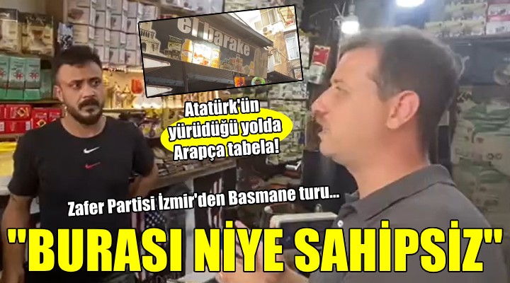 SONKALEİZMİR-Zafer Partisi İzmir İl Başkanı Seçkin Boyunağa ve partililer İzmir'in Konak ilçesindeki Basmane semtinde esnaf turuna çıktı. Sosyal medya hesabından açıklama yaparak bölgedeki Suriyeli yoğunluğuna dikkat çeken Boyunağa, Arapça tabelaların çokluğuna tepki gösterdi.