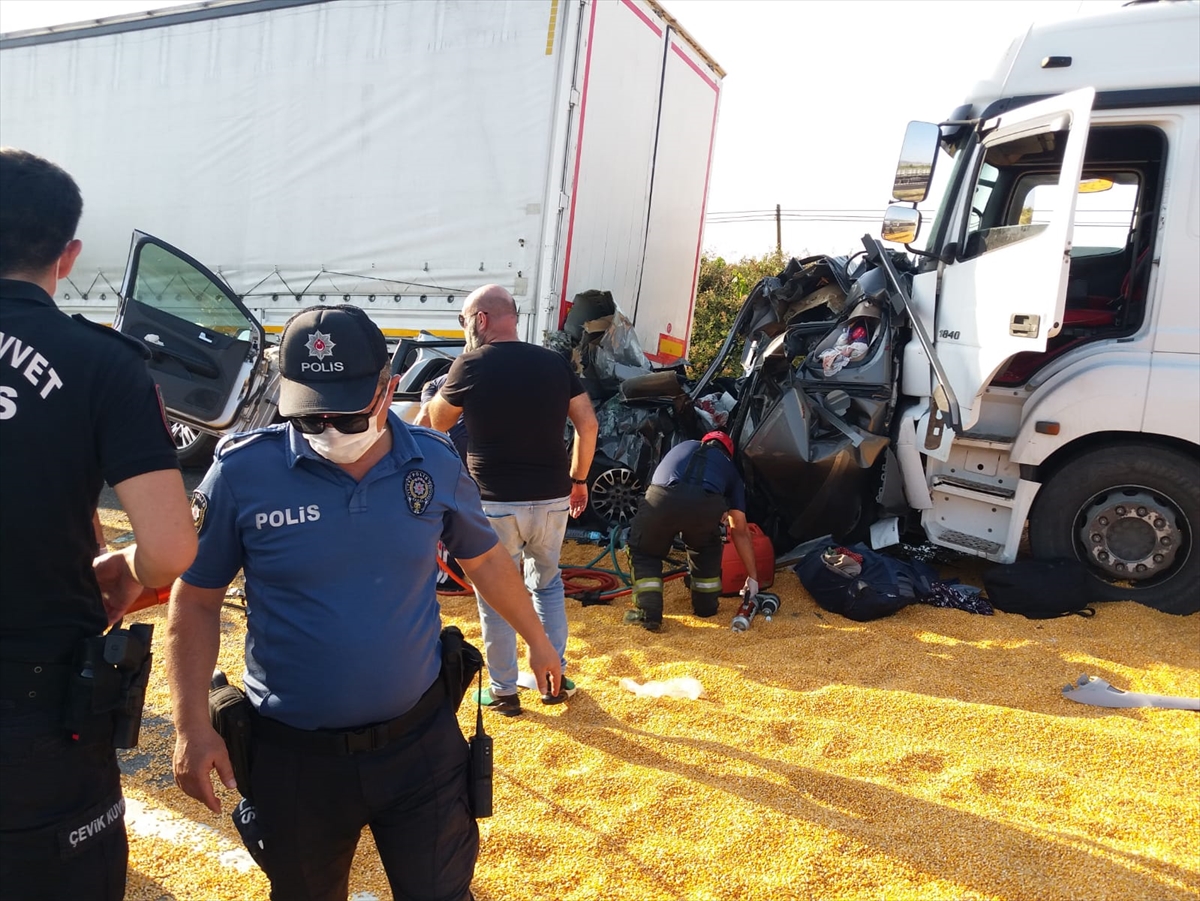 Alınan bilgiye göre, İzmir-Ankara kara yolunda sürücüsü henüz öğrenilemeyen 45 SC 9121 plakalı tır, Alaşehir Kavşağı yakınlarında yoğun trafik nedeniyle duraksadı. Bu sırada seyir halindeki mısır yüklü 31 K 1060 plakalı bir başka tır, önündeki 35 GZ 130 ve 45 SA 3368 plakalı iki otomobili sürükleyerek duraksayan tıra çarptı.