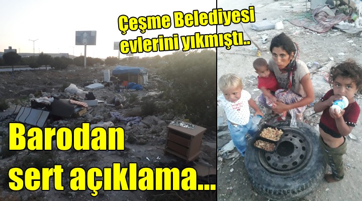 Bölgede yaşayan Roman yurttaşların hurdacılık ve kağıt toplayıcılığı gibi işlerle uğraştığına, bir kısmının çocuklarının da okula devam ettiğine işaret eden baro, "Yaşam alanlarının iptidai koşullarda olduğu, temel hijyen ve su gibi ihtiyaçların karşılanmasında güçlükler çekildiği, söz konusu alana kısa süre önce ihtiyaçların giderilmesi için İzmir Büyükşehir Belediyesi tarafından su deposu kurulduğu, bölgede sağlıklı konutlarda yaşam alanları oluşturulması için çalışmalar yapıldığı, kısa süre öncesine kadar sorunlarının kalıcı olarak çözülmesi için girişimlerde bulunulduğu öğrenilmiştir. Tüm bu gelişmelere karşın önceki gün Çeşme Belediyesi tarafından herhangi bir ön uyarı yapılmadan söz konusu alana müdahale edildiği, çadır ve barakalarının yıkıldığı, yerleşim alanının iş aletleriyle düzeltildiği, açıkta kalan insanların alanı terke zorlandığı ve bu nedenle aralarında çocuk ve yaşlıların da olduğu Roman yurttaşlarımızın hak ve özgürlüklerinin ciddi şekilde ihlal edildiği ifade edilmektedir" bilgisini verdi.