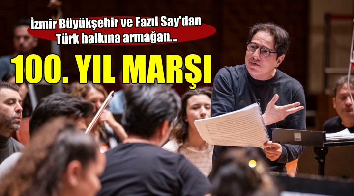 Cumhuriyet’in kuruluşunun 100. yılına unutulmaz bir armağan bırakmaya hazırlanan İzmir Büyükşehir Belediyesi, bestesini dünyaca ünlü piyanist Fazıl Say’ın yaptığı 100. Yıl Marşı’nın kaydını tamamladı. Ahmed Adnan Saygun Sanat Merkezi’nde (AASSM) pek çok ünlü ismi buluşturan ve bir gün süren marşın kaydı özel bir günde Türkiye’yle buluşmaya hazırlanıyor. Coşku, heyecan ve gururun yansıması olan marşın şiirini Ayten Mutlu kaleme alırken, orkestra şefliğini Can Okan, koro şefliğini ise İlhan Akyunak üstlendi. Marşın seslendirmesini ise Ahmed Adnan Saygun Senfoni Orkestrası ve Korosu ile Genç Koro (Işılay Saygın Güzel Sanatlar Lisesi Korosu) yaptı.