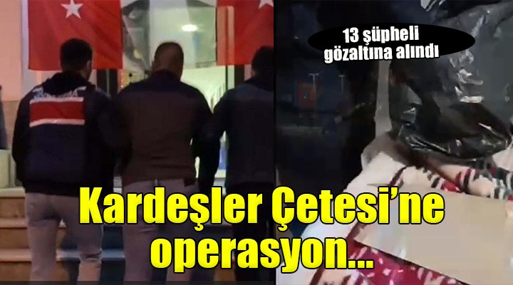 Kiraz Cumhuriyet Savcılığı koordinesindeki İzmir İl Jandarma Komutanlığı Kaçakçılık ve Organize Suçlarla Şube Müdürlüğü ve Kiraz İlçe Jandarma Komutanlığı, Kiraz ve Ödemiş ilçelerinde 'Kardeşler Çetesi' olarak bilinen suç örgütü üyelerine yönelik çalışma başlattı. 'Uyuşturucu madde imal ve ticareti', 'suça azmettirme', 'hırsızlık', '6136 SKM', 'yağma', 'mala zarar verme', 'fuhuşa yer temin etme', 'suç delillerini yok etme', 'gizleme veya değiştirme', 'kumar oynanması için yer ve imkan sağlama' suçlarını örgütlü olarak işledikleri belirlenen suç örgütü üyelerinin yakalanması için gece saatlerinde operasyon düzenlendi. Şüphelilere ait evlerde yapılan aramalarda 41,7 gram metamfetamin, 25 gram kokain, 3 uyuşturucu hap, 0,5 litre olduğu değerlendirilen sıvı hale getirilmiş uyuşturucu madde, 18 uyuşturucu kullanma aparatı, 2 tabanca, 4 av tüfeği, 27 mermi, 84 av tüfeği fişeği, muhtelif miktarda senet ve alacak defteri ele geçirildi. Yapılan operasyonda 13 şüpheli yakalanarak gözaltına alındı. 1 şüphelinin yakalama çalışmalarının sürdüğü bildirildi.