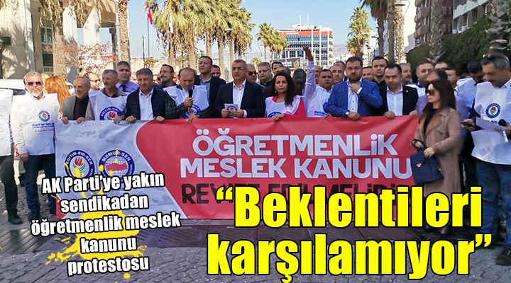 SONKALEİZMİR-AK Parti'ye yakınlığıyla bilinen Memur-Sen Konfederasyonu'na bağlı Eğitim-Bir-Sen'in İzmir şubesi üyeleri bugün Konak SGK İl Müdürlüğü önünde Öğretmenlik Meslek Kanunu'nu (ÖMK) protesto etti. "Kanun köstek değil, bize destek olsun", "Sınav iptal olsun, tartışma son bulsun", "Sınavla kariyer öğretmene bariyer" sloganları atan öğretmenler, hükümete ÖMK'nın revize edilmesi için çağrı yaptı.