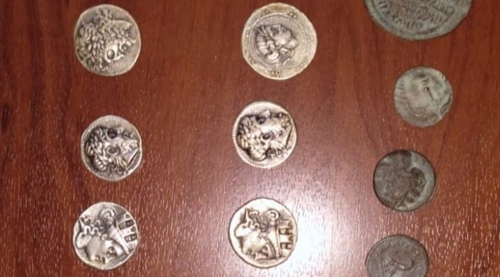 Yapılan arama sonucu, araçta bulunan V.A'nın üzerinde Roma Dönemi'ne ait 21 sikke ele geçirildi.