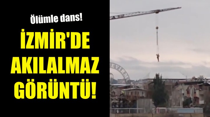 Gaziemir Sarnıç bölgesindeki bir şantiyede kule vinçin ucundaki halata tutunan işçi metrelerce yükselikte adeta ölüme meydan okudu.