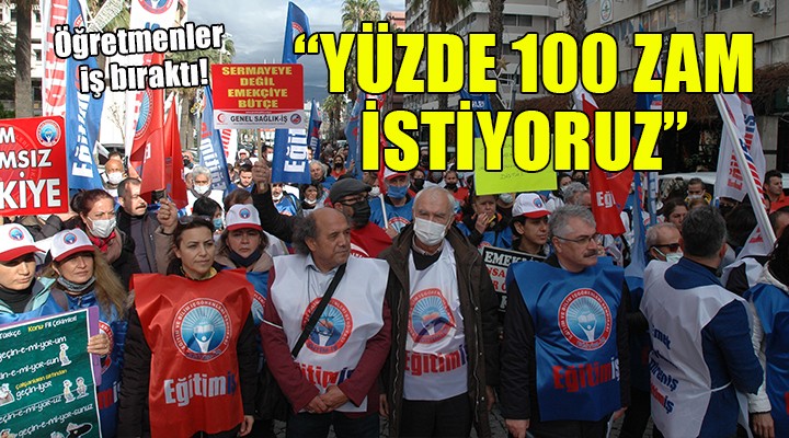 SONKALEİZMİR-Eğitim İş Sendikası'nın Türkiye'de bir günlük iş bırakma kararı sonrası İzmir'de de öğretmenler sahaya indi. Konak'ta toplanıp eski Sümerbank önüne yürüyen öğretmenler, "Sermayeye değil, emekçiye bütçe", "Emeklilikte insanca yaşam her öğretmenin hakkıdır", "Enflasyon rakamlarından payımıza açlık, yoksulluk, sömürü düştü" yazılı dövizler taşıyıp, "Mustafa Kemal'in öğretmeniyiz", "Zam zulüm işkence işte AKP", "Saraylar sizin, alanlar bizim" sloganları attı.