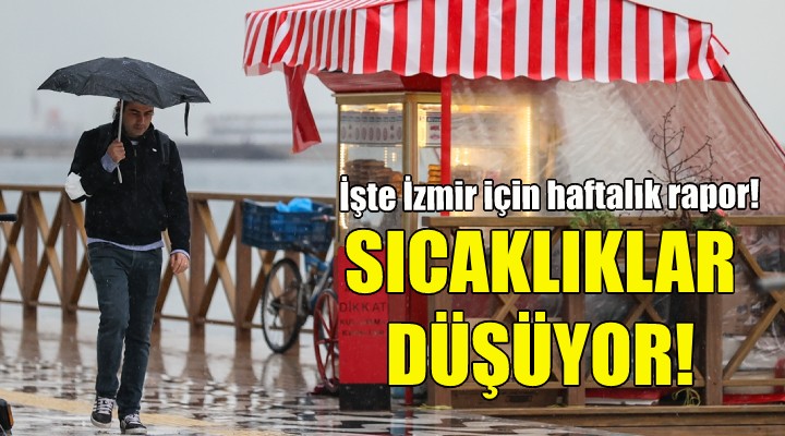 Yeni haftaya yağışlı ve 23 derecelik sıcaklıkla başlayan İzmir'de de yarından itibaren sıcaklıklar düşmeye başlayacak. Sıcaklık Cuma günü 11 dereceye kadar düşecek. Hafta boyunca kentte yağış etkili olacak.