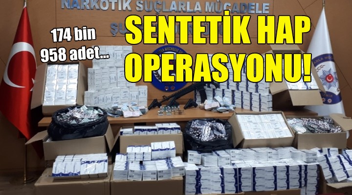Bornova ilçesinde belirlenen adres ve 2 araçta gerçekleştirilen aramalarda, kırmızı ve yeşil reçeteye tabi 174 bin 958 sentetik ecza, 3 tabanca, 1 tüfek, 4 şarjör, 113 mermi ele geçirildi.