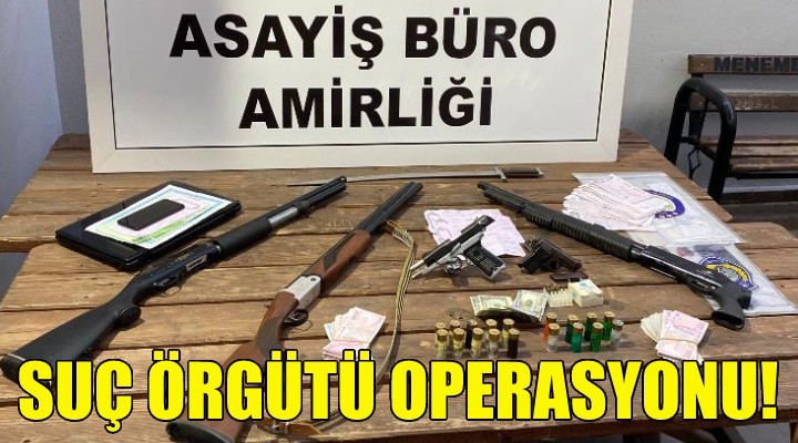 Menemen İlçe Emniyet Müdürlüğü Asayiş Büro Amirliği ekipleri; tefecilik, dolandırıcılık, tehdit ve şantajla suç örgütü kurduğu belirlenen şüphelilere yönelik 5 adrese eş zamanlı operasyon düzenledi.