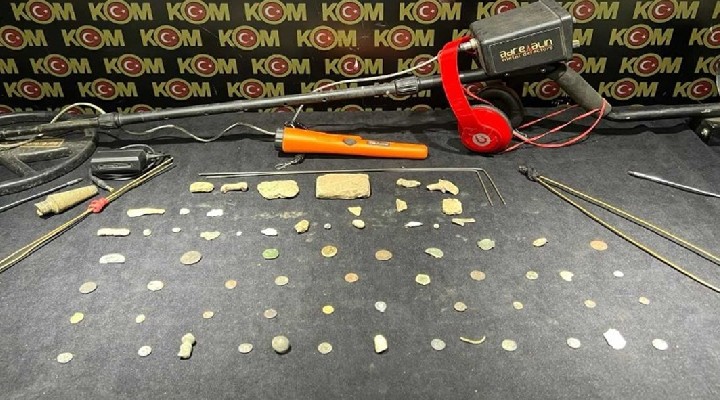 Yapılan aramada Osmanlı ve Bizans dönemine ait 67 sikke ile tarihi obje, 2 dedektör, 2 alan tarama cihazı ele ve kazma ele geçirildi, bir şüpheli gözaltına alındı.