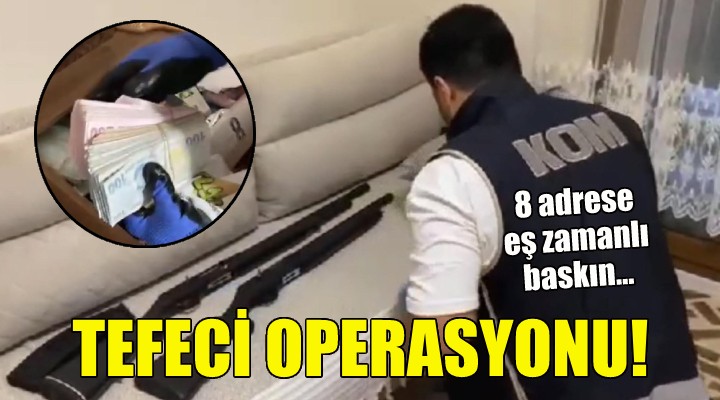 Buca, Karabağlar ve Menderes ilçelerinde belirlenen 8 ayrı adrese, bu sabah yapılan eş zamanlı operasyonda 7 şüpheli yakalandı. Aramalarda 4 ruhsatsız tüfek, 22 av tüfeği kartuşu, 1 ruhsatsız tabanca, 60 fişek, borçluların adlarının yazdığı 4 ajanda, çeşitli isimlere düzenlemiş 74 senet, 15 tapu senedi, 8 çek, 72 belge (sözleşme, vekaletname) ve suçtan elde edildiği sanılan 1 milyon 590 bin TL ele geçirildi.