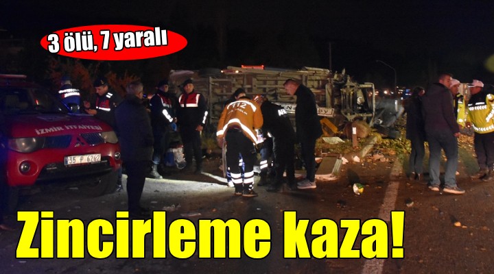 Sürücüsü henüz belirlenemeyen 03 AFU 332 plakalı patates yüklü kamyon, Kemalpaşa-Torbalı kara yolu Nazarköy kavşağında, kırmızı ışıkta bekleyen 3 otomobil, 1 kamyon, 1 hafif ticari araç ve 1 minibüse çarptı. Kamyon daha sonra devrildi.