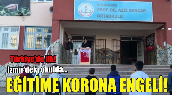 İzmir’in Narlıdere ilçesinde Prof. Dr Aziz Sancar Ortaokulu'nda koronavirüs nedeniyle eğitime ara verildi. 710 öğrencinin bulunduğu okulda öğretmenlerin de virüse yakalandığı belirtildi. Koronavirüs nedeniyle Türkiye'de ilk defa bir okulda eğitime ara verilmiş oldu.