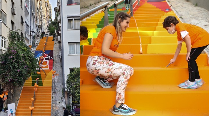 Etkinliğe katılan lösemili çocuklar, gençler ve gönüllüler merdivenleri turuncuya boyadı.